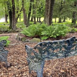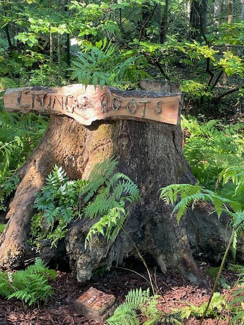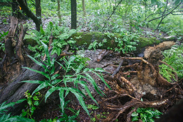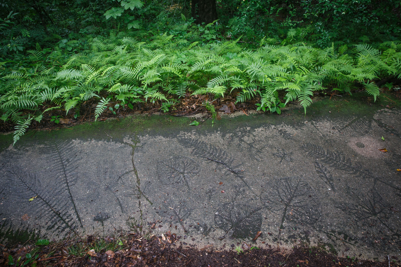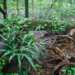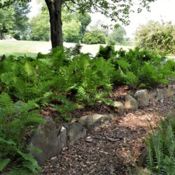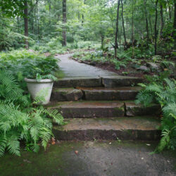 The woodland garden is designed using a Victorian stumpery theme. Rot-resistant logs and stumps of osage orange, black locust, mulberry, and eastern red cedar are natural sculptures highlighting and contrasting with the luxuriousness of ferns and the delicate woodland companion plants.