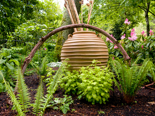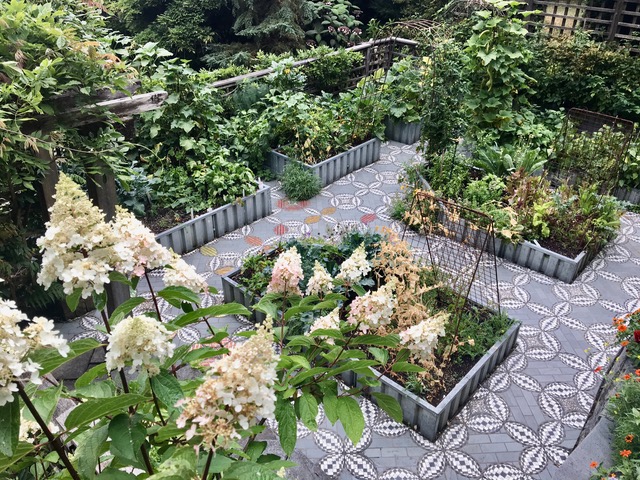 Undaunted by a steeply sloped hillside, Millie has devoted decades to realizing her garden vision. An extensive network of paths, staircases, retaining walls, terraces, and a bridge using wood, stone, and metal tame her steep ravine. This nearly 2 acre woodland garden of ferns, hardy fuchsia, hellebores, trillium, hostas, ligularia and brunnera thrive on their shady hillside perch. Deciduous azaleas and many varieties of hydrangeas, including velvety-leafed Hydrangea aspera, add color and texture. Millie’s award winning 500 square foot vegetable garden, built using artist made intricately patterned pavers, is both beautiful and productive. The grand result: A Northwest garden masterpiece!