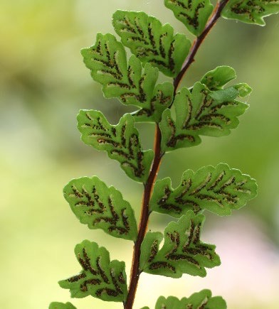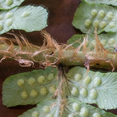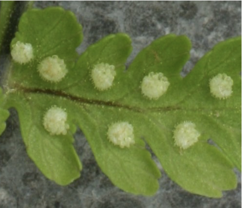 Sori: spores brown on the outer edges of pinna; indusium fist like opening star like from under the SporangiaWoodsia Fern Charact 1 - WOODWARDIA