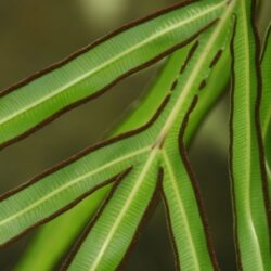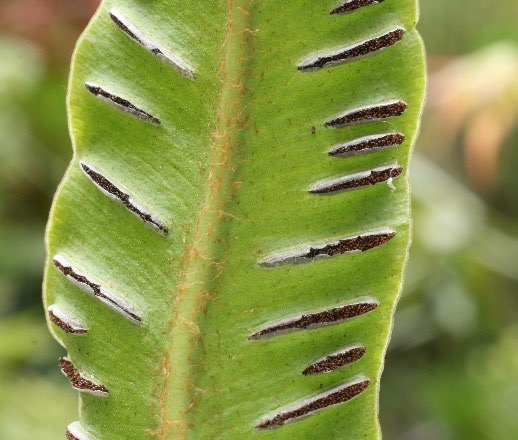 Sori: sori linear occupying entire space from midrib to the pinna tip of fertile frond segment; indusium linear with central lengthwise opening (slit down the middle)