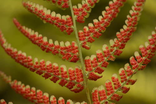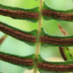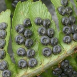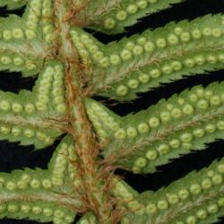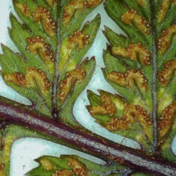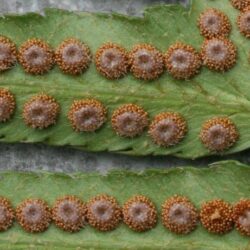 Sori: spore black when ripe; sori on veins, round in 1 row between midrib and margin, indusium when young hood-shaped, often falling at maturity- DRYOPTERIS