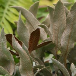 Pyrrosia – 63 species – Southern Hemisphere and SE Asia, mostly subtropical to tropical, few temperate; epiphytic and terrestrial – common name: felt fern